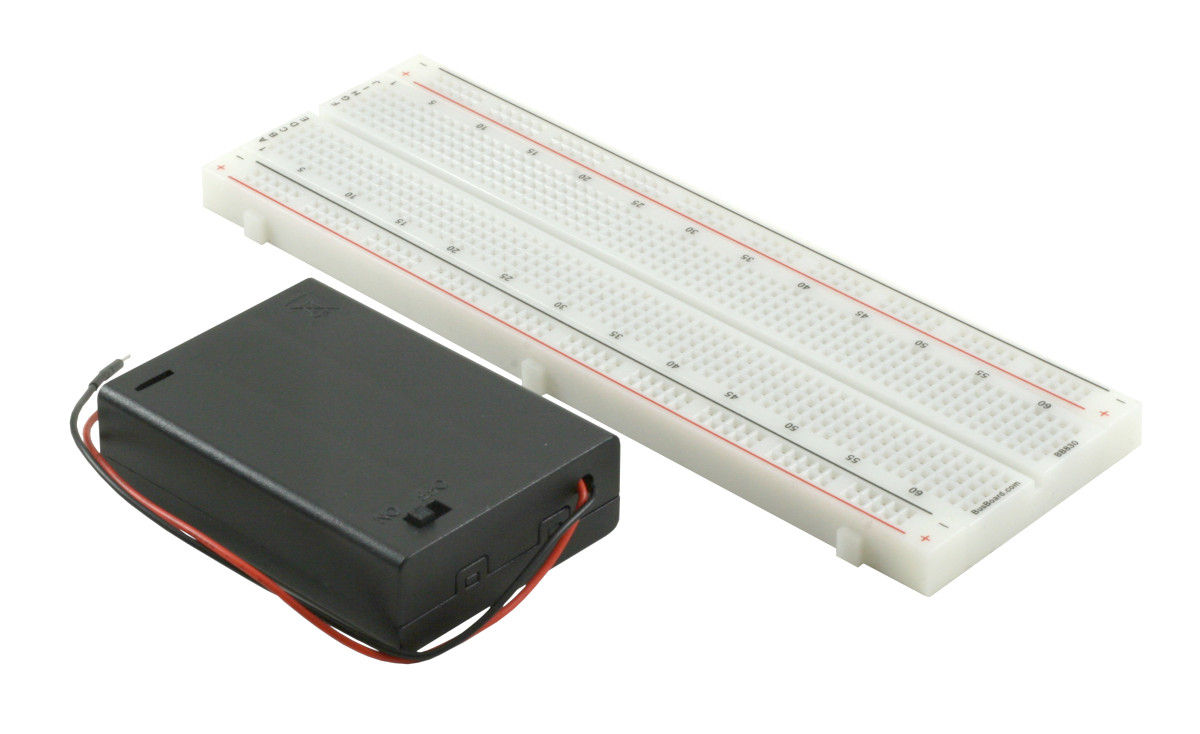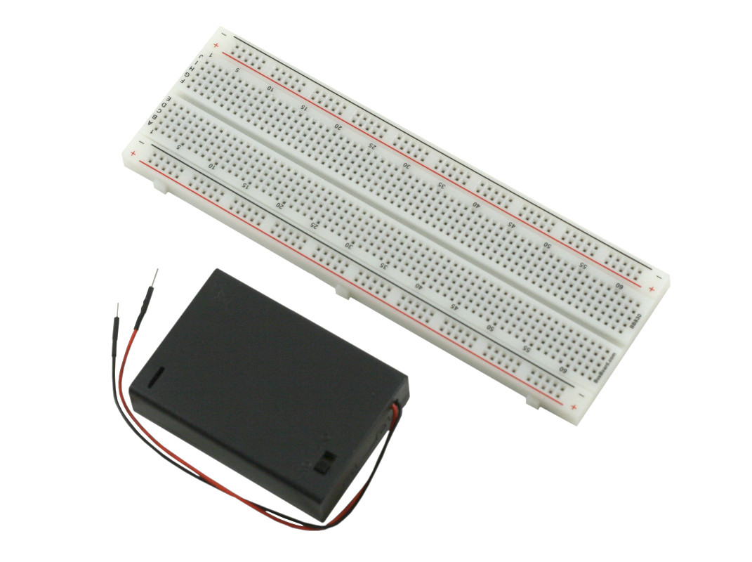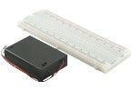 BreadBoard-830 is a solderless (plug-in) breadboard with 830 connection tie-points (i.e. 830 wire insertion holes). It has 4 power rails. Solderless breadboards are great for building and testing new circuits because parts can be easily inserted and removed. They are completely re-usable. The BB830 has a 630 tie-point IC-circuit area plus four 50 tie-point power rails. The housing is made of white ABS plastic, with a printed legend giving numbers and letters for columns and rows. The internal contacts are phosphor bronze with a plated nickel finish. A peelable adhesive tape backing is provided for attaching it to a surface and an optional metal back plate is provided. BPS BreadBoards are Lead-Free and RoHS Compliant. Finished projects can be moved to a BR1 or SB830 Solderable PC BreadBoard to make them permanent..The PW-3AA battery box has breadboard pins designed to plug into your breadboard. The machined male breadboard pins with strain relief heatshrink tubing provide a reliable long-lasting connection (as opposed to tinned wires that fatigue and break).