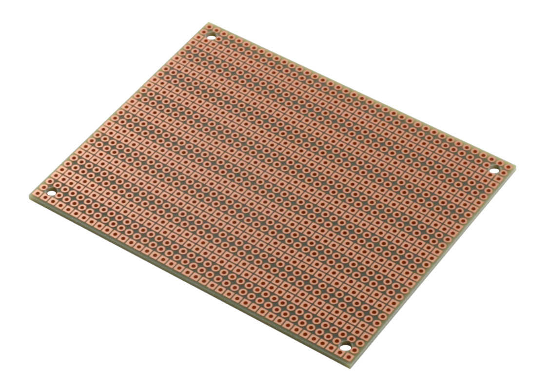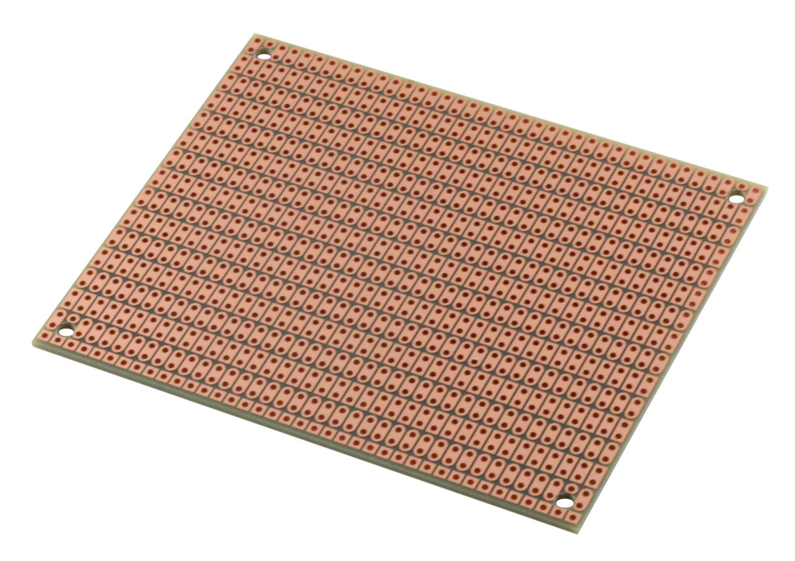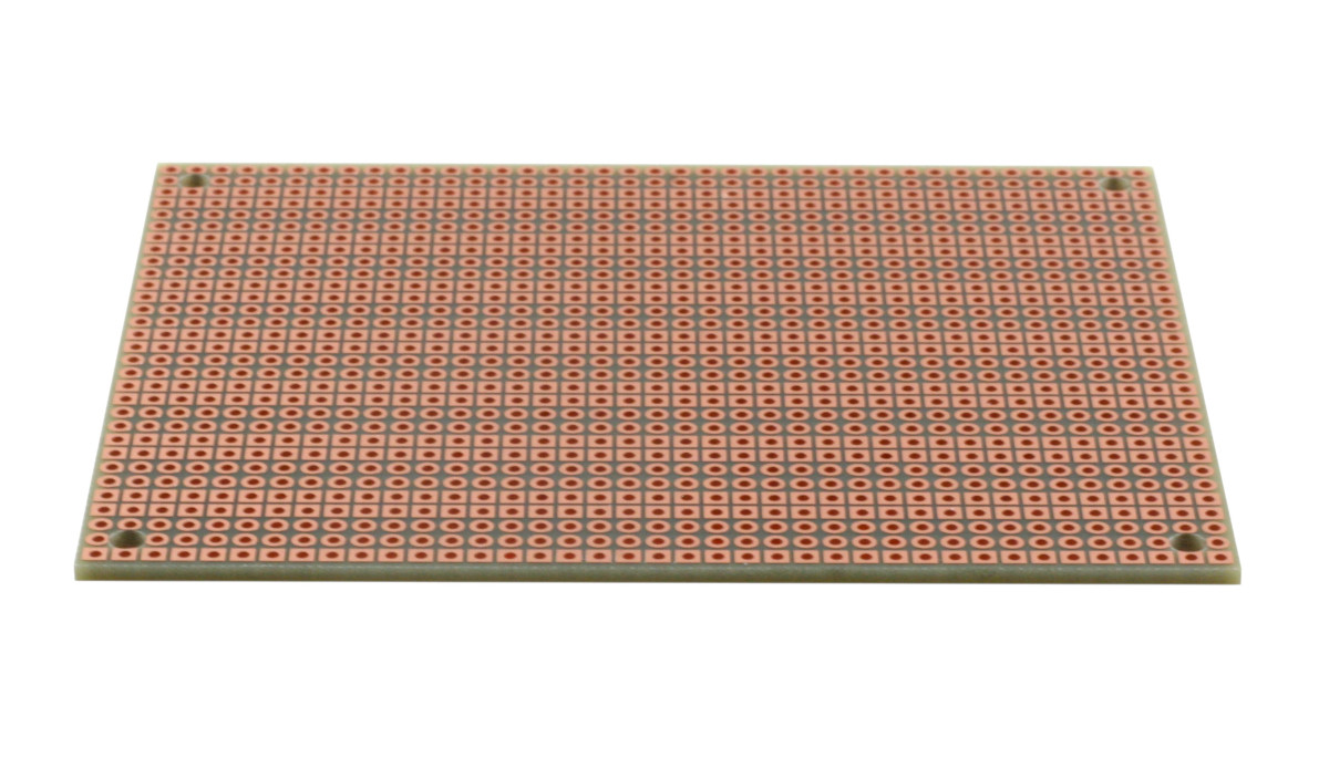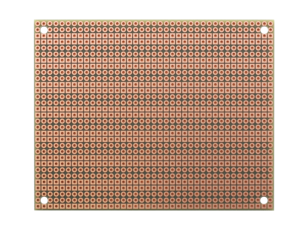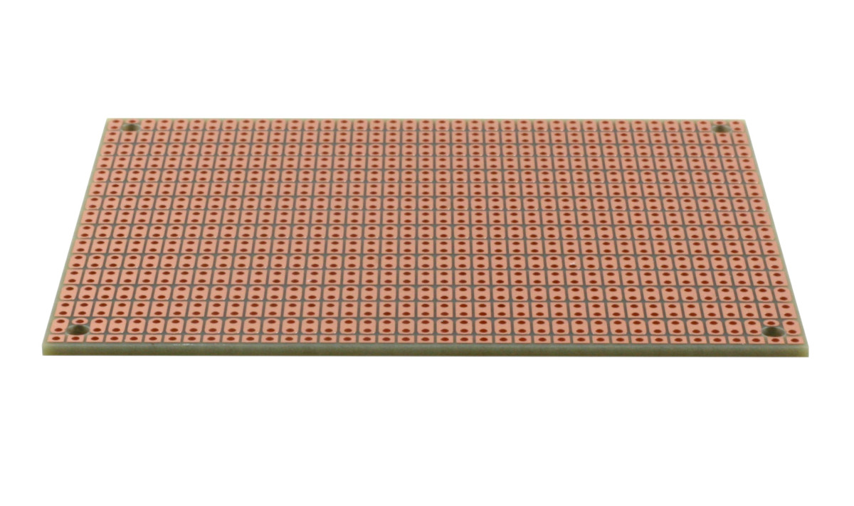 PR2H2-DR uses a high-quality FR4 glass-epoxy base that has higher stability and lifespan than vintage stripboard materials. An anti-tarnish coating protects the copper for a long shelf-life and provides easy soldering. The four 0.125" mounting holes are unplated to avoid shorting adjacent tracks in case they need to be used. They are sized for 4-40 size screws and are positioned on the 0.1” design grid.